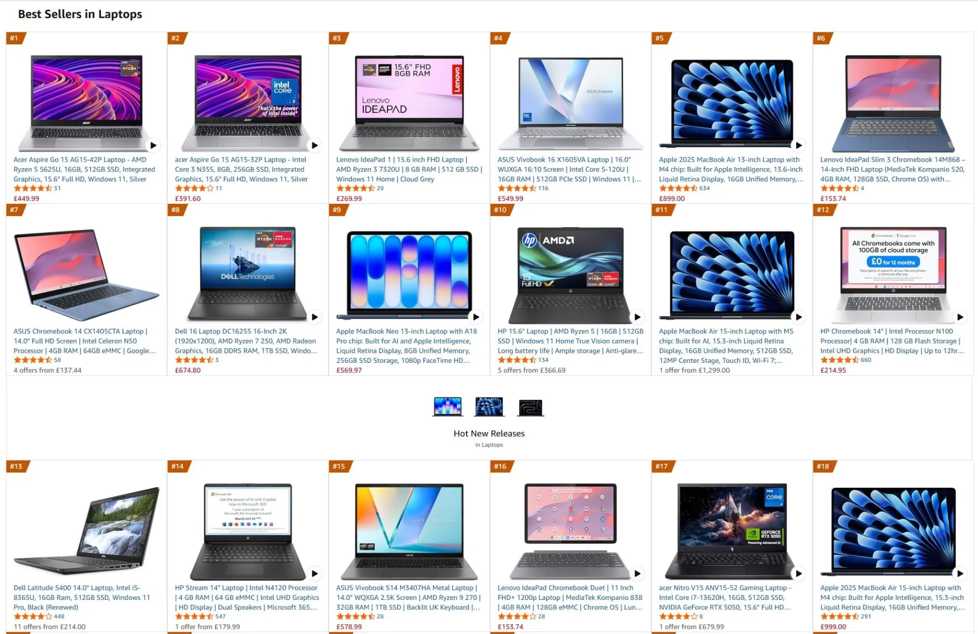 To put this into perspective, the best selling laptop on Amazon UK as of March 2026 is the Acer Aspire Go 15, priced at £449 (screenshot). On paper it's compelling: a hex-core Ryzen 5 5625U, 16GB of memory, 512GB SSD, and a 15.6" 1080p panel. More memory, more storage, and it's even upgradable. The MacBook Neo sits at £569.97 on the same page.